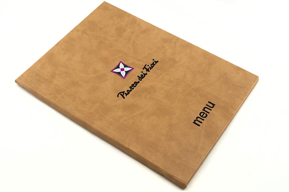 Radimo jelovnike u tvrdom povezu (lepenka 3mm presvučena platnom plus zlatotisk sa logom firme), sa dodatkom plastičnog mehanizma koji drži štampani material.